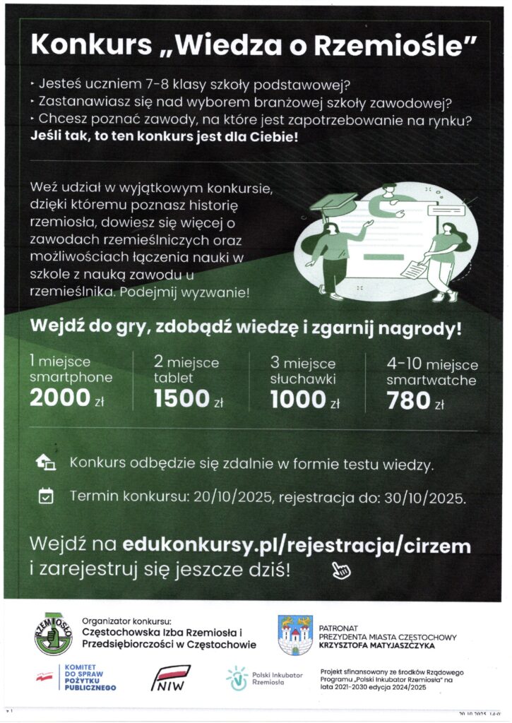 Informujemy, że termin zgłoszenia oraz wykonania testu głównego w konkursie „Wiedza o Rzemiośle” uległ wydłużeniu do 30.10.2025 r.
